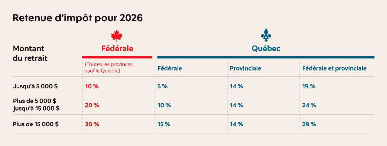 Lorsque vous faites un retrait de votre REER, les fonds sont assujettis à une retenue d’impôt à la source1. Le gouvernement s’assure ainsi que vous payez immédiatement un certain impôt sur votre retrait. N’oubliez pas que lorsque vous ajouterez le retrait à votre déclaration de revenus, vous pourriez devoir payer plus d’impôt si la retenue d’impôt était insuffisante.