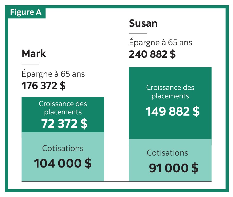 - Profitant d’un plus grand horizon (15 ans de plus) et de l’effet des intérêts composés, les cotisations de Suzanne (91 000 $) ont fructifié jusqu’à atteindre une valeur de 240 882 $, tandis que les cotisations de Marc (104 000 $) se sont accrues pour s’établir à 176 372 $ (64 510 $ de moins que l’épargne-retraite de Suzanne).
