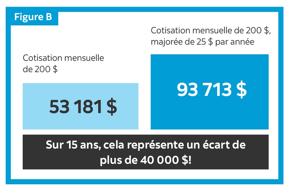 Le graphique illustre la croissance d’une cotisation mensuelle de 200 $ sur 15 ans, et celle d’une augmentation de 25 $ chaque année pour la même période.
