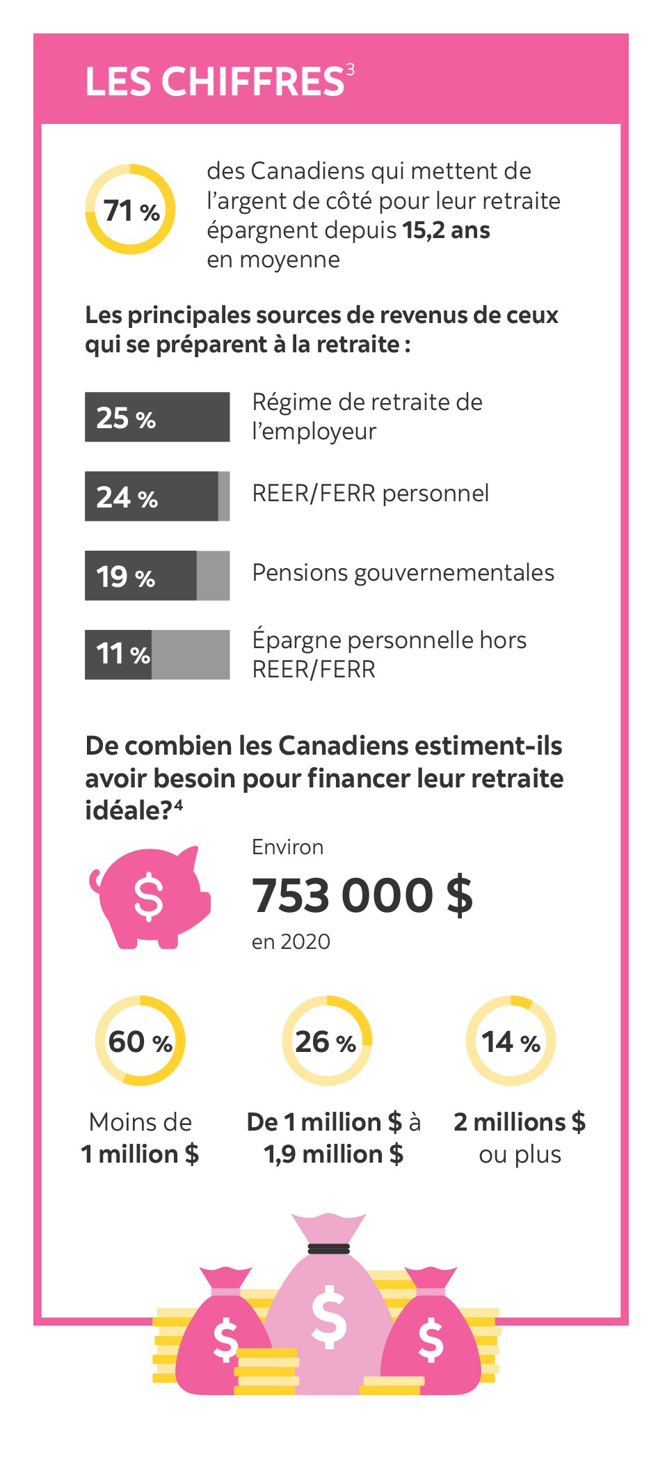 Même si la cotisation à des placements à long terme (en vue de la retraite) est de nos jours la principale priorité financière des Canadiens1, toutes les raisons semblent bonnes pour reporter la croissance de l’épargne : se débarrasser d’une dette étudiante, épargner pour acheter une maison ou attendre de pouvoir faire des cotisations plus importantes.