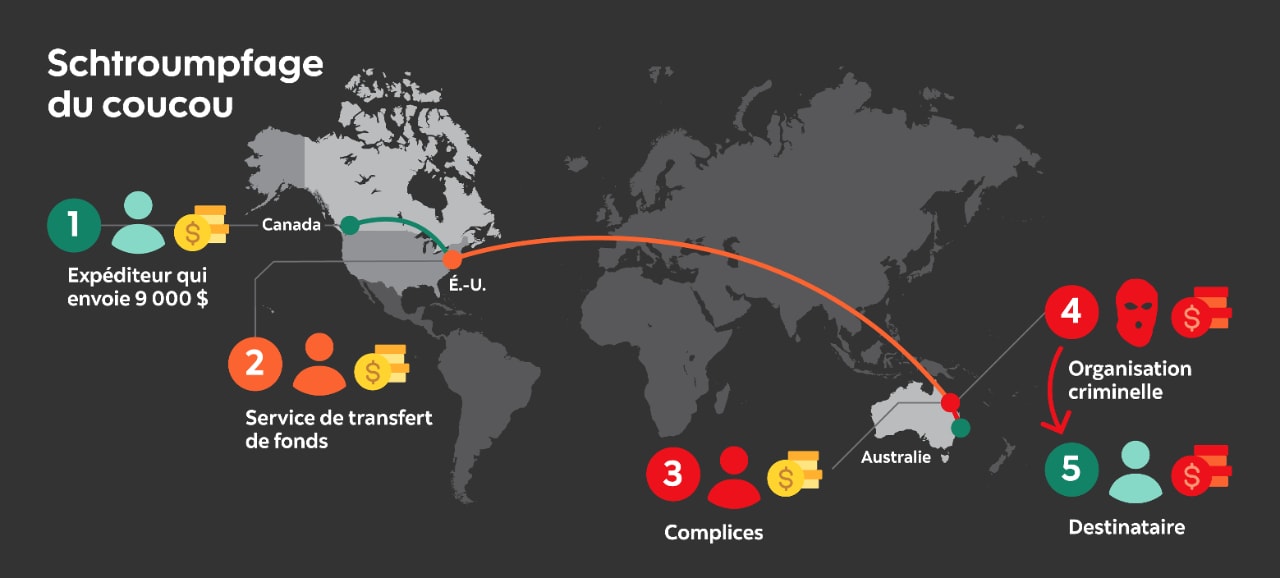 Les criminels cherchent toujours de nouvelles façons de déjouer les autorités. Au cours des dernières années, ils s’emploient à une nouvelle forme de blanchiment d’argent surnommée « schtroumpfage du coucou » (traduction : cuckoo smurfing). Si son nom semble enfantin, il s’agit en fait d’un stratagème de blanchiment d’argent complexe qui touche les consommateurs au quotidien sans qu’ils s’en rendent compte.