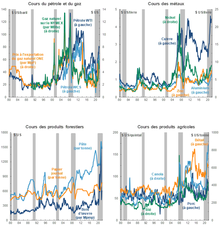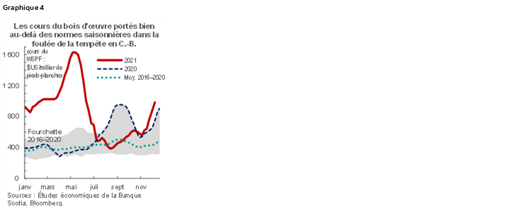 Dans la semaine qui a précédé les inondations et les glissements de terrain qui se sont abattus sur la Colombie-Britannique, les cours du WSPF se sont établis à une moyenne de 555 $ US le millier de pieds-planches; la semaine dernière, la valeur par unité s’est hissée à 985 $ US. De nombreuses usines restent coupées des forêts et des clients dans la foulée de la tempête, ce qui a conforté les gains de prix, qui ont tendance à se produire dans les mois de l’hiver (graphique 4), lorsque les constructeurs achètent des produits en prévision des travaux du printemps. La météo anormalement clémente de l’automne a pu elle aussi contribuer à allonger la saison de construction plus que d’habitude. Les perspectives fondamentales restent vigoureuses. Nous nous attendons à ce qu’aux États-Unis, les mises en chantier de logements repassent l’an prochain la barre des 1,5 million de logements. En novembre, elles ont frôlé le 1,7 million de logements en chiffres désaisonnalisés et annualisés, ce qui représente le deuxième plus haut mensuel depuis 2006. Le doublement des droits de douane américains sur le bois d’œuvre canadien en date du 2 décembre 2021 devrait lui aussi augmenter les pressions qui s’exercent sur les prix.