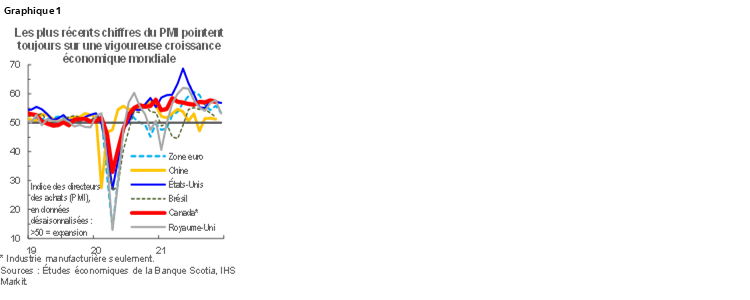 Presque partout dans le monde, la croissance économique reste vigoureuse à l’heure où l’économie mondiale continue de se rétablir et de sortir de convalescence pendant la COVID-19 (graphique 1), ce qui explique toujours les déséquilibres de l’offre et de la demande et les pressions qui pèsent généralement sur les prix. Les chiffres de l’inflation ont continué de pulvériser des records de plusieurs dizaines d’années dans le mois écoulé.