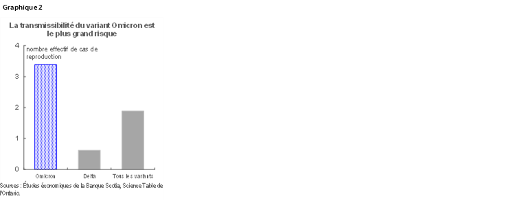 Nos prévisions intègrent une légère incidence négative sur la croissance pour ce trimestre et le suivant en raison du nouveau variant Omicron de la COVID-19. Cette incidence s’explique essentiellement par l’idée que la propagation du variant fera peser l’incertitude sur les dépenses des consommateurs et sur l’activité des entreprises, sans qu’on puisse s’attendre à un reconfinement à grande échelle. Nous allons réévaluer nos prévisions de croissance et de taux le mois prochain en tenant compte des nouvelles restrictions désormais adoptées et des nouvelles données qui seront publiées. Omicron paraît plus transmissible que les précédentes itérations virales (graphique 2, page 3). Toujours est-il que le courant des actualités sur le variant a dominé les marchés financiers en décembre, puisque les investisseurs craignaient que ce variant déclenche de nouveaux confinements et tétanise la demande de produits de base.