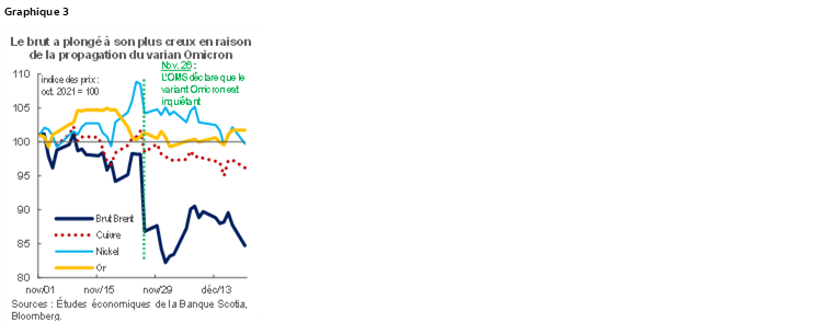 - Craignant que les restrictions liées au nouveau variant Omicron de la COVID-19 fragilisent les marchés dominés par la demande de produits de base, nous avons intégré, dans nos prévisions économiques, une légère incidence liée à l’incertitude.