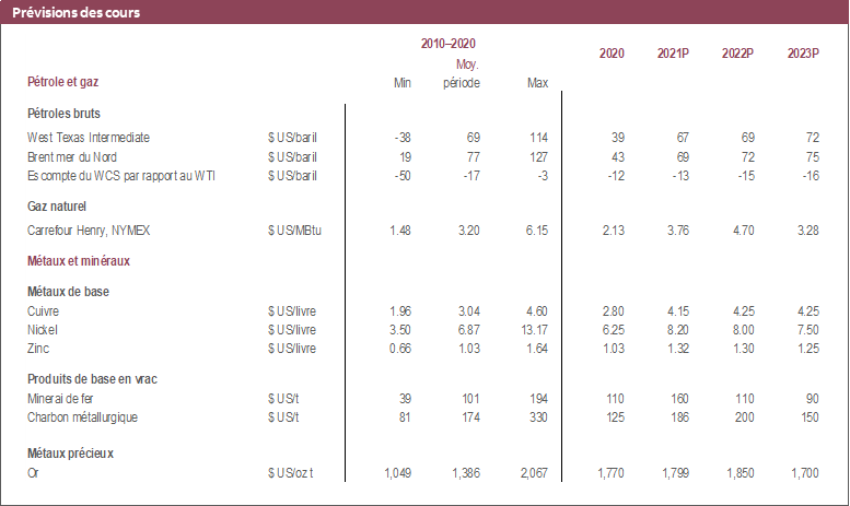 Le nouveau variant a infligé une raclée aux cours du pétrole. Le jour même où l’Organisation mondiale de la Santé a déclaré que le variant Omicron était préoccupant, l’indice phare du brut mondial Brent a plongé de 10 $ US le baril (11,5 %) (graphique 3, page 3); même si cette baisse ne s’est pas produite en même temps que la date d’expiration des contrats à terme des mois rapprochés, elle confirme aussi clairement que l’on s’attendait à une baisse de la consommation de carburant dans les prochains mois. Il va de soi que nous ne nous étions pas avancés sur le rythme de la propagation du variant Omicron ni sur l’ampleur de la baisse des cours. Or, nous avons essentiellement projeté, dans la mise à jour la plus récente de nos prévisions sur les cours des produits de base, que le courant des actualités lié à la pandémie provoquerait la volatilité des valeurs du brut. Les nouvelles liées à la prolifération du virus et aux mesures de confinement continueront certes de peser sur les valeurs du brut à terme. Pourtant, nous signalons qu’au moment d’écrire ces lignes, le marché physique est tendu. Par exemple, les stocks de pétrole américain du carrefour de Cushing dans l’Oklahoma ont enchaîné une troisième hausse hebdomadaire d’affilée, même s’ils sont toujours aussi faibles par rapport à ce qu’ils étaient récemment.
