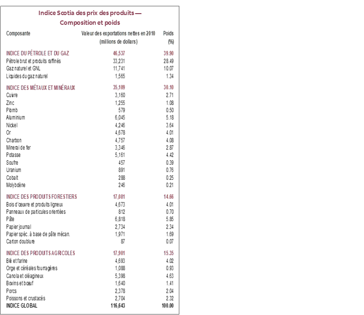 Le présent indice a été conçu pour suivre les variations des prix au comptant ou de vente en dollars US pour des marchandises et des produits manufacturés à base de matières premières du Canada sur les marchés d’exportation. Le poids de chaque produit repose sur la valeur de ses exportations nettes en 2010. Avant janvier 2007, le poids de chaque produit reposait sur la valeur de ses exportations entre 1995 et 1997. Toutefois, dans le cas du brut et des produits pétroliers raffinés, du papier de pâte maigre non couché et du carton doublure, on utilisait la valeur des exportations nettes. Le Canada importe une grande quantité de ces produits; par conséquent, l’emploi de la seule valeur des exportations aurait surestimé leur contribution à la performance commerciale du Canada.