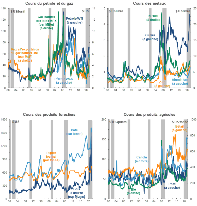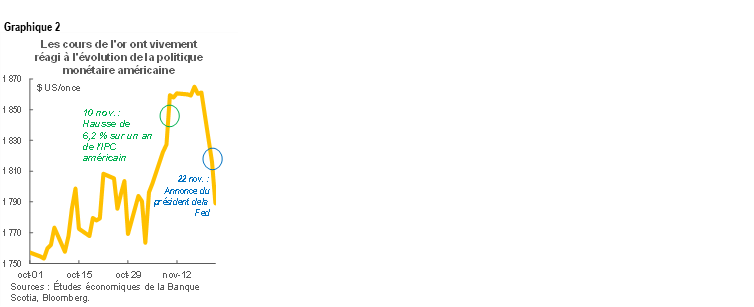 En novembre, les cours de l’or ont bondi pour franchir temporairement la barre des 1 860 $ US l’once pour la première fois depuis juin 2021. Les investisseurs dans le lingot réagissent manifestement à l’angoisse inflationniste, comme le laisse entendre le décollage des valeurs depuis la publication, au début du mois, d’une hausse plus forte qu’escomptée sur un an de l’indice des prix à la consommation aux États-Unis (graphique 2). Le discours conciliant soutenu de plusieurs banques centrales a renforcé les gains des cours et semble avoir contribué à l’attrait de l’or comme valeur refuge contre l’inflation. Or, le métal jaune a perdu presque 50 $ US l’once le lundi lorsqu’on a annoncé que le président américain Joe Biden reconduirait Jerome Powell à la présidence de la Réserve fédérale, ce que les marchés ont interprété comme un signal de durcissement. Pourtant, nos prévisions sur un taux d’inflation supérieur à la cible et sur des taux d’intérêt américains toujours aussi faibles dans la prochaine année laissent entendre que les valeurs du lingot sont solidement étayées en 2022.