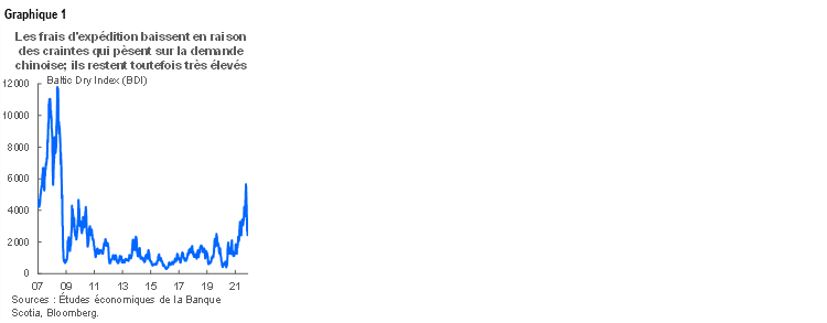 Combien de temps dureront les pressions qui s’exercent sur les cours? Nous continuons de croire qu’elles s’expliquent essentiellement par l’incapacité des chaînes logistiques mondiales à répondre à la demande dans les premières étapes de la reprise de l’économie mondiale. Nous nous attendons à ce que ces déséquilibres s’amoindrissent en enchaînant avec la nouvelle année, lorsque nous exercerons un meilleur contrôle de la COVID-19 à l’échelle mondiale. En fait, les frais d’expédition — récemment évoqués comme un obstacle majeur qui se dresse contre la croissance partout dans le monde — paraissent déjà se réduire par rapport au sommet en 12 ans atteint au début de l’année (graphique 1, page 1). Cette baisse s’explique probablement en partie par les craintes récentes d’un ralentissement de la croissance en Chine; il y a toutefois de mauvaises nouvelles sur la propagation potentielle du virus.