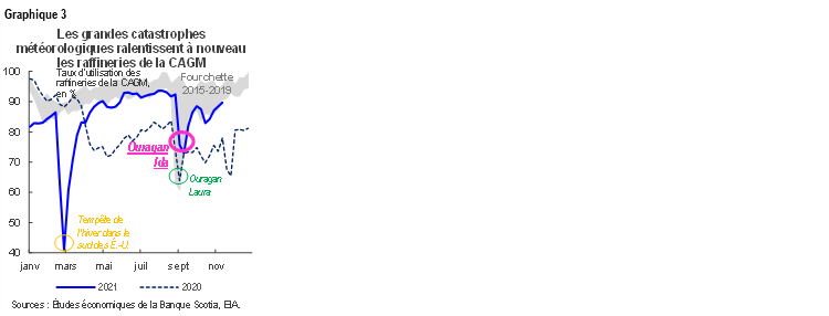 Le rabais du WCS par rapport au WTI explose; en novembre, il a franchi deux fois la barre des 20 $ US le baril et s’est établi à une moyenne de l’ordre de 19 $ US le baril — ses plus hauts depuis la période qui a précédé la pandémie. Nous attirons l’attention sur trois facteurs dans le creusement du différentiel. D’abord, comme nous l’avons fait observer à maintes reprises dans les derniers mois, la hausse de la production de l’OPEP+ a augmenté l’offre des barils de pétrole lourd sur la côte américaine du golfe du Mexique (CAGM), ce qui est venu dénouer l’avantage de l’Ouest du Canada jusqu’alors pendant la pandémie. En outre, la production albertaine est nettement supérieure aux niveaux atteints avant la pandémie, alors que la production de la Saskatchewan continue de reprendre du mieux. Deuxièmement, la capacité des raffineries de la CAGM doit encore rebondir depuis les fermetures liées à l’ouragan Ida (graphique 3, page 2); autrement dit, la demande exprimée pour le brut lourd canadien et les autres bruts lourds à affiner est moins forte. Enfin, nous pensons que les cours élevés du gaz naturel ont pour effet d’accroître les coûts des raffineries.