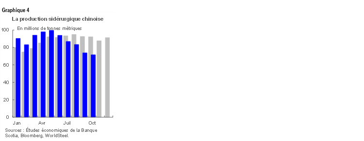 En novembre, les cours du minerai de fer ont continué de glisser en raison des contingents chinois adoptés dans la production de l’acier; ils ont toutefois augmenté vers la fin du mois lorsqu’on a annoncé que les sidérurgistes seraient sans doute en mesure de reprendre la production. Les cours ont clôturé à des creux de 90 $ US la tonne en novembre — leur niveau le plus faible depuis mai l’an dernier. Pourtant, les données d’octobre laissent entendre que la Chine a pu réduire, de janvier à octobre, sa production sidérurgique par rapport aux niveaux du début de l’année (graphique 4, page 2) —il s’agit d’un véritable exploit, compte tenu du démarrage en force en 2021 — ce qui donne une marge pour hausser la production dans les prochains mois. Ces mouvements cadrent avec nos prévisions. Nous avions déjà prévu que les cours rebondiraient à l’heure où l’assouplissement des restrictions chinoises permet de plus en plus de hausser la production sidérurgique et d’améliorer la demande de minerai de fer en prévision des Jeux olympiques d’hiver de 2022 à Beijing et dans la foulée de ces jeux.