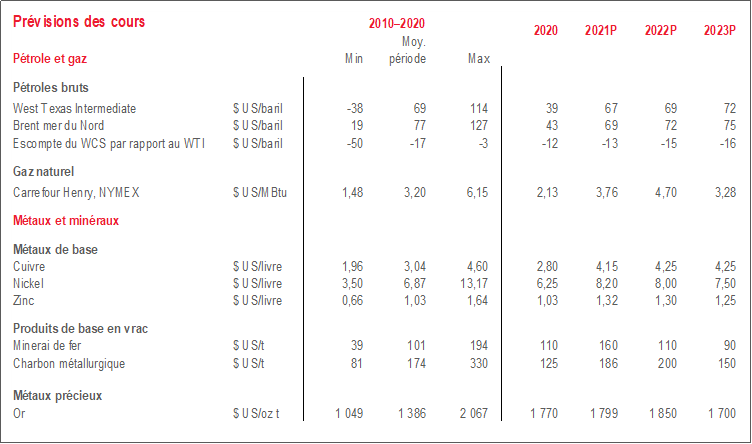 En novembre, les cours du nickel ont continué d’augmenter : leur moyenne, qui s’est établie à un peu moins de 9 $ US la livre, a été la plus élevée depuis février 2012. Une partie de cette évolution pourrait s’expliquer par les pluies saisonnières dans les Philippines, ce qui a limité la capacité d’exportation de ce pays et ce qui explique que l’on s’attende à ce que le marché se durcisse. Le métal a aussi profité de la vigueur de la demande d’acier inoxydable et de sa rareté par rapport aux problèmes de la chaîne logistique. Il semble que les cours aient également bien réagi à des chiffres plus solides qu’escompté pour l’indice PMI européen de novembre — publié cette semaine. Nous entrevoyons toujours un risque de suroffre l’an prochain, à l’heure où la production de fonte de première fusion nickélifère de l’Indonésie se relève, ce qui pourrait faire baisser les prix; toutefois, le nickel entamera probablement 2022 sur un élan nettement plus vigoureux que ce que nous annonçons dans notre dernier compte rendu prévisionnel.