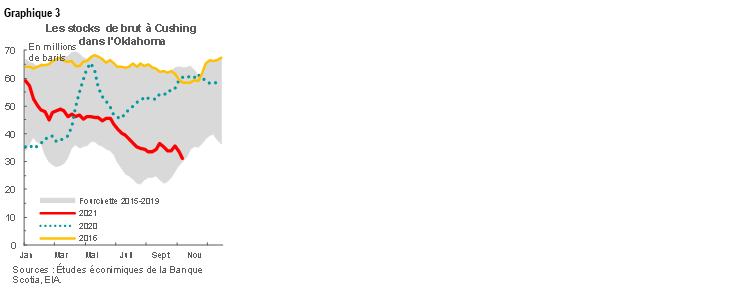 Les consommateurs d’énergie recherchent des combustibles de rechange en raison du bond des cours du gaz; puisque la consommation de gaz augmente, les stocks de pétrole du carrefour de stockage de Cushing ont atteint leur plus creux depuis 2018 (graphique 3) et le WTI a franchi la barre des 80 $ US le baril pour la première fois depuis 2014. Nous nous attendons toutefois à ce que les cours du pétrole léger s’amoindrissent pour reprendre, au début de l’an prochain, la trajectoire prévue auparavant, ce qui donnera lieu à des prix de 75 $ US le baril de Brent et de 72 $ US le baril de WTI d’ici la fin de 2022. À court terme, nous nous attendons à ce que le moral du marché fluctue considérablement en réaction au courant des actualités pandémiques.