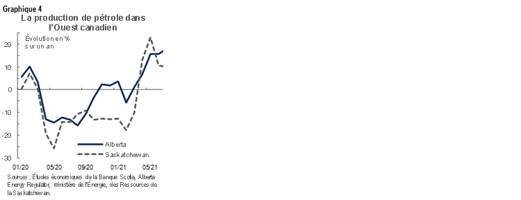 Si nous projetons la hausse des cours du WCS de concert avec ses pendants pour le brut léger, nous nous attendons à ce que le rabais entre l’indice repère du Western Canadian Select et le WTI se creuse pour se rapprocher de 15 $ US le baril d’ici la fin de 2022. Pour établir essentiellement cette trajectoire, nous supposons que le dénouement des plafonds de production de l’OPEC+ augmente le nombre de barils de pétrole acide lourd offert sur la côte américaine du golfe du Mexique — première destination des importations marginales de brut de l’Ouest canadien — ce qui aura pour effet de détendre le marché. Dans nos prévisions les plus récentes, nous supposons que le différentiel entre le WTI et le WCS augmente légèrement pour s’établir à une moyenne d’à peine plus de 14 $ US le baril dans le prochain trimestre. L’augmentation de la capacité de transport grâce au lancement de l’oléoduc de la Ligne 3 d’Enbridge devrait permettre de compenser une flambée généralisée, à laquelle on peut normalement s’attendre dans un environnement de fortes hausses de la production de brut de l’Ouest canadien (graphique 4) après la fin des revirements saisonniers dans les raffineries.