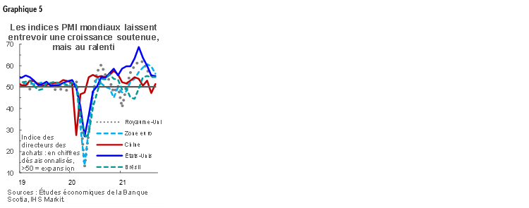 Dans la dernière mise à jour de nos prévisions, nous supposons que le déséquilibre entre la demande et l’offre de l’économie partout dans le monde est plus tenace que ce que nous avions prévu à l’origine. La demande reste vigoureuse dans de nombreux pays qui se déconfinent pendant la COVID-19; or, de plus en plus, les réseaux de production et de transport n’arrivent pas à répondre assez rapidement à la demande. Ces pressions sont vives en Amérique du Nord : les pronostics sur la production automobile ont été amoindris, l’activité manufacturière continue de fléchir, et on comptabilise chaque mois un nombre record de postes vacants. Nous avons récemment abaissé nos prévisions sur la croissance économique nord-américaine en tenant compte de ces forces, alors que le contingentement de la production pour endiguer les émissions locales a pour effet d’abaisser les perspectives économiques de la Chine.