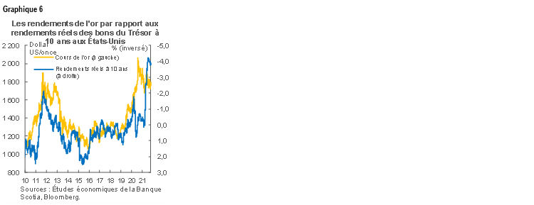 Nos prévisions pour les cours de l’or restent essentiellement inchangées au moment d’écrire ces lignes. Nous nous attendons toujours à ce que 2022 soit une bonne année pour les cours du lingot, et nous avons comptabilisé une valeur moyenne statistiquement élevée de 1 850 $ US l’once. Les valeurs du métal jaune ont tendance à suivre les taux américains réels (graphique 6), ce qui devrait rester de bon augure, puisqu’on s’attend à ce que l’incertitude perdure dans la pandémie et la reprise économique, à ce que la politique monétaire américaine reste conciliante et à ce que l’inflation continue de progresser — ce qui explique que le métal jaune soit considéré comme une valeur refuge. Nous nous attendons à ce que l’or commence à converger vers son cours à long terme de 1 500 $ US l’once lorsque les taux de la banque centrale américaine commenceront à se normaliser en 2023.
