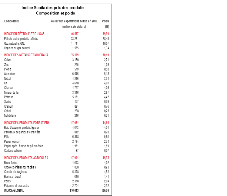 Le présent indice a été conçu pour suivre les variations des prix au comptant ou de vente en dollars US pour des marchandises et des produits manufacturés à base de matières premières du Canada sur les marchés d’exportation. Le poids de chaque produit repose sur la valeur de ses exportations nettes en 2010. Avant janvier 2007, le poids de chaque produit reposait sur la valeur de ses exportations entre 1995 et 1997. Toutefois, dans le cas du brut et des produits pétroliers raffinés, du papier de pâte maigre non couché et du carton doublure, on utilisait la valeur des exportations nettes. Le Canada importe une grande quantité de ces produits; par conséquent, l’emploi de la seule valeur des exportations aurait surestimé leur contribution à la performance commerciale du Canada.