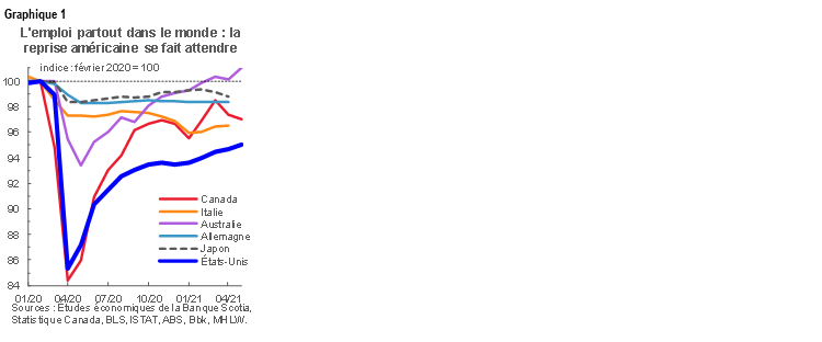 Les données publiées pour le Canada et les États-Unis en mai font état du taux d’inflation le plus élevé depuis le début des années 2000; nous nous attendons toujours à ce que, dans le bilan de l’économie, l’offre augmente suffisamment dans les prochains mois pour modérer le rythme de l’accroissement des prix et rapprocher l’inflation de sa cible. C’est pourquoi nous croyons toujours que la Banque du Canada haussera, au T3 de 2022, son taux directeur et que la Réserve fédérale américaine commencera probablement à déboucler son bilan en janvier 2022 avant de hausser ses taux d’intérêt au T2 de 2023. D’ici là toutefois, il se peut que les prix bondissent à cause des pénuries de produits. La léthargie relative du marché du travail américain (graphique 1) plaide pour le prolongement des mesures de relance monétaires; toutefois, il est probable que ce marché prenne du mieux.