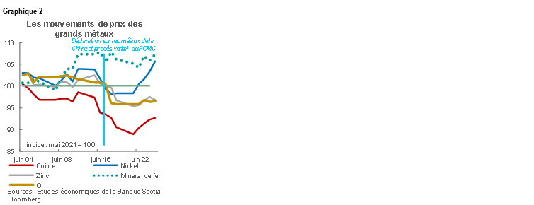 Le lingot a été l’une des victimes du durcissement du discours de la Réserve fédérale américaine en juin (graphique 2, page 2). Une séance après la publication du dernier procès-verbal du FOMC, les cours de l’or ont perdu plus de 80 $ US l’once : il s’agit du plongeon intraséance le plus brutal depuis août l’an dernier. Si le métal jaune a culminé dans l’année écoulée, c’est grâce au cadrage de la banque centrale américaine, qui tolère le surciblage de l’inflation et qui veillera à ce que les taux restent faibles dans les prochaines années. Ni l’une ni l’autre des plateformes de la politique monétaire n’a été abandonnée dans le procès-verbal de juin du FOMC; or, l’amélioration des projections de l’inflation et de la croissance et un basculement de certains membres du comité qui préfèrent avancer les hausses de taux ont de toute évidence amené certains acheteurs d’or à repenser leurs attentes vis-à-vis des taux réels américains.