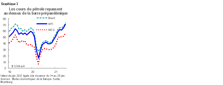 Le brusque rebond des grands indices repères du brut a perduré en juin, et les fondamentaux ont continué de se fortifier. Au moment d’écrire ces lignes, le WTI et le Brent avaient tous deux atteint leur plus haut depuis la fin de 2018 (graphique 3), après avoir franchi la barre des 70 $ US le baril et atteint une moyenne d’environ 50 % de plus, depuis le début de l’année, que pour l’ensemble de 2020. Aux États-Unis, l’activité des raffineries a continué de prendre de la vitesse en juin, tout comme la consommation de carburant — dont le carburant d’aviation malmené, à l’heure où la reprise a progressé et alors que les voyages sont relancés. La colonne de l’offre du marché a elle aussi pour effet de tendre l’équilibre : dans la semaine du 18 juin 2021, les valeurs du brut ont plongé à leur plus creux depuis mars 2020, et la production est toujours nettement inférieure aux niveaux prépandémiques.