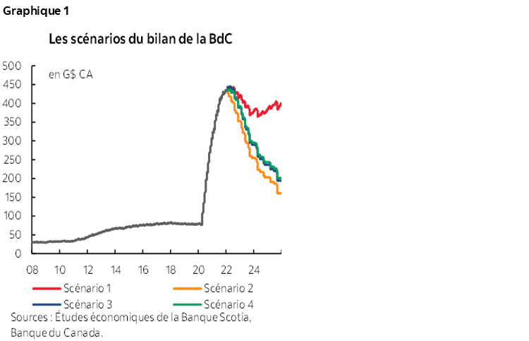 Je m’attends à ce que dans un scénario plausible, la BdC adopte un parcours de réductions mesurées des rachats bruts par rapport à 4 ou 5 G$ CA par mois à l’heure actuelle, en prévoyant des réductions de 1 G$ à 2 G$ dans chaque réunion du Rapport sur la politique monétaire sur le parcours qui lui permettra de mettre complètement fin à ses réinvestissements et de renoncer à des plafonds de délestage dans un délai de 9 à 12 mois. Ce parcours correspond au tracé vert du graphique 1. Un parcours plus ambitieux est viable et serait justifié selon mon avis personnel; or, il est très improbable que la BdC souhaite faire ce qu’a fait la RBNZ en mettant brusquement fin à ses réinvestissements et en faisant plutôt appel à des ventes d’actifs en gestion.