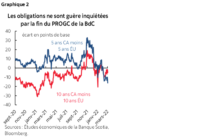 Il faut dire que les membres du personnel ne connaissent peut-être pas assez bien les marchés pour tirer cette conclusion sur les effets du Programme de rachat d’obligations du gouvernement du Canada, indépendamment des autres forces qui guident les rendements obligataires. Quoi qu’il en soit, jetons un coup d’œil sur les transactions menées à l’époque. Le graphique 2 nous apprend que la période qui s’est écoulée juste avant que la BdC commence à délester son bilan en octobre 2020 jusqu’après la fin de l’assouplissement quantitatif en octobre dernier a été marquée par l’indifférence dans les écarts sur les obligations canadiennes par rapport aux obligations américaines à échéance comparable. Puisque la Fed a continué de racheter des titres à coups de milliards, les marchés étaient loin de s’inquiéter de la possibilité que la BdC mette fin à son propre programme de rachats.