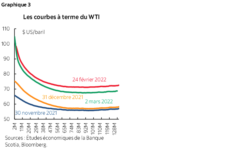 À partir de là, le parcours des prix du pétrole est un autre élément d’incertitude, en partie à cause de l’Ukraine et en partie parce que l’OPEP+ impose sa volonté aux consommateurs partout dans le monde. En s’en remettant à la mise en garde habituelle selon laquelle les prix à terme ne permettent sans doute pas de prévoir exactement les prix au comptant à terme, la courbe des contrats à terme du pétrole laisse entendre que les prix du pétrole pourraient être temporairement supérieurs à la cible (graphique 3). Or, la période externe de la courbe indique même que les prix du pétrole sont assez élevés pour justifier la rentabilité de la plupart des projets.