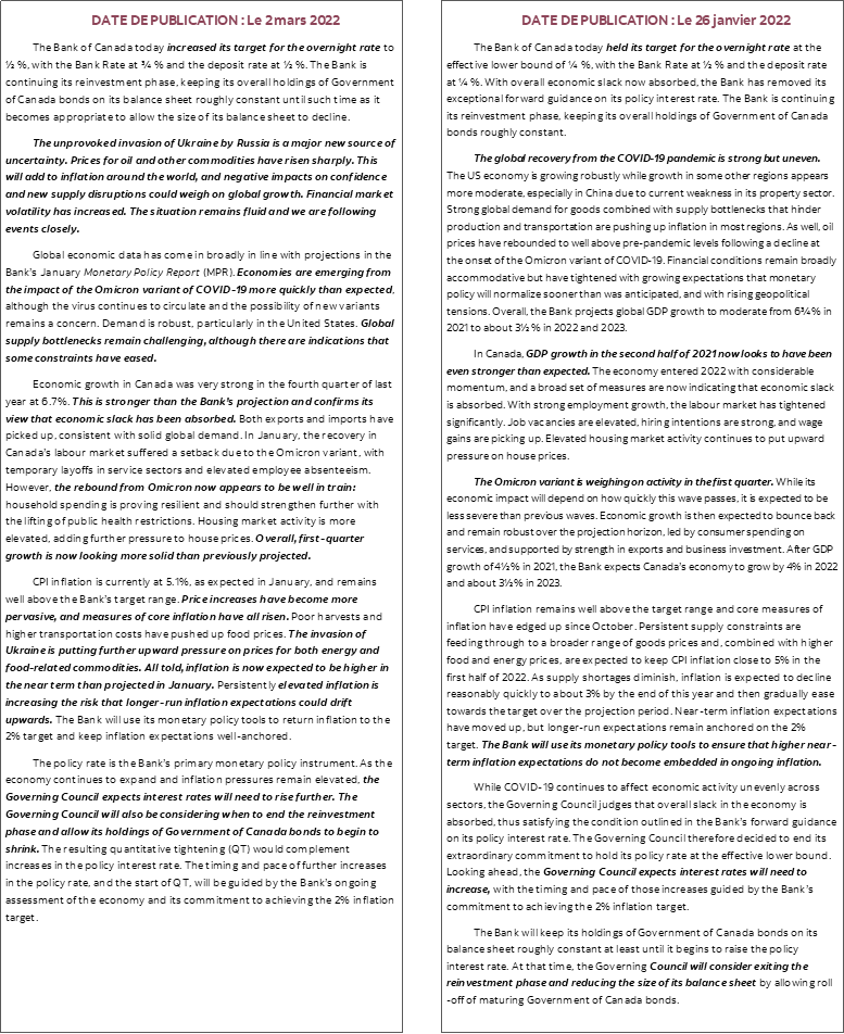 - Mondialement, on affirme par contre que les statistiques économiques mondiales évoluent de concert avec les attentes de la BdC, mais on enchaîne en disant que « [l]es effets du variant Omicron de la COVID-19 sur l’économie s’estompent plus rapidement qu’on s’y attendait », ce qui laisse entendre qu’on pourrait réviser les prévisions à la hausse avant d’évaluer plus attentivement l’incidence de la guerre en Ukraine.