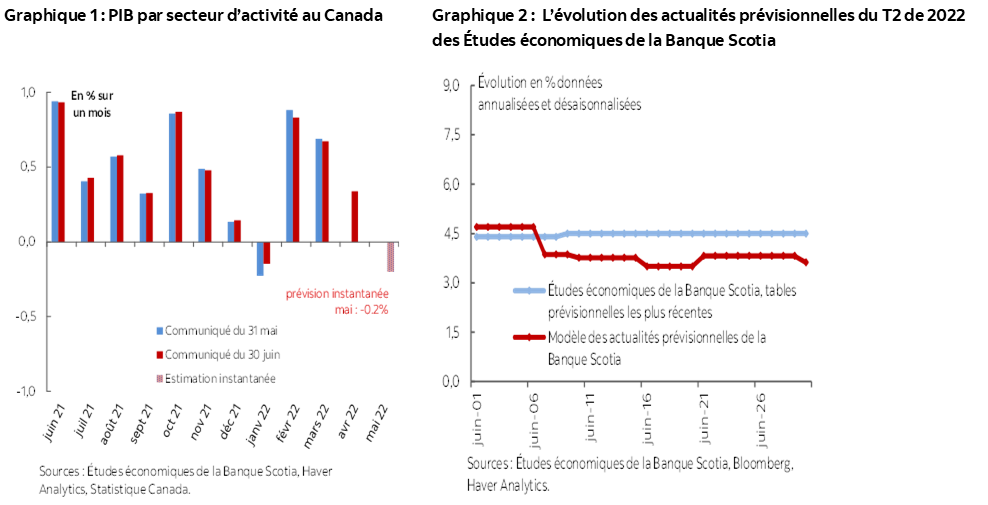 - Cette note fait partie d’une série qui sera publiée dans la foulée d’importants communiqués statistiques pour documenter les comptes rendus mécaniques des actualités prévisionnelles du PIB canadien d’après le modèle des actualités prévisionnelles de la Banque Scotia. L’évolution de ces actualités prévisionnelles viendra éclairer les perspectives macroéconomiques officielles des Études économiques de la Banque Scotia.