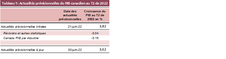 - Statistique Canada a publié ce matin son verdict sur la croissance économique du Canada dans les derniers mois. Selon le portrait qu’elle trace de l’économie canadienne, cette croissance a entamé le T2 de 2022 à vive allure, en gagnant +0,3 % sur un mois en avril; le PIB a ensuite fait brusquement marche arrière en mai (‑0,2 % sur un mois). Dans l’ensemble, l’information nouvelle a porté à la baisse, à 3,62 % sur un trimestre, en données désaisonnalisées et annualisées, les actualités prévisionnelles du PIB canadien pour le T2 de 2022 malgré la très forte incertitude de ce chiffre, en raison essentiellement du risque considérable de révisions du PIB au niveau de l’industrie.