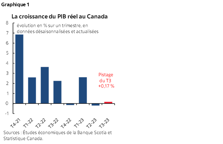 C’est ce qui explique les deux trimestres léthargiques consécutifs. Les « actualités prévisionnelles » du PIB trimestriel qu’établissent les Études économiques de la Banque Scotia ressortent à environ 0,5 % sur un trimestre en données désaisonnalisées et en rythme annualisé au T3.