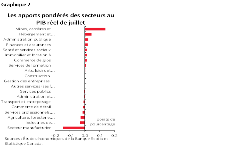 Le graphique 2 donne la ventilation de la croissance du PIB par secteur. Ainsi, Statistique Canada a signalé que l’activité manufacturière avait été en juillet le poids le plus lourd à peser sur la croissance du PIB. Cette agence a fait observer que la moindre formation des stocks était un poids et qu’il fallait aussi entre autres tenir compte des effets de la grève portuaire de la Colombie‑Britannique, qui a limité l’offre de produits, surtout dans les secteurs comme la fabrication de produits chimiques.