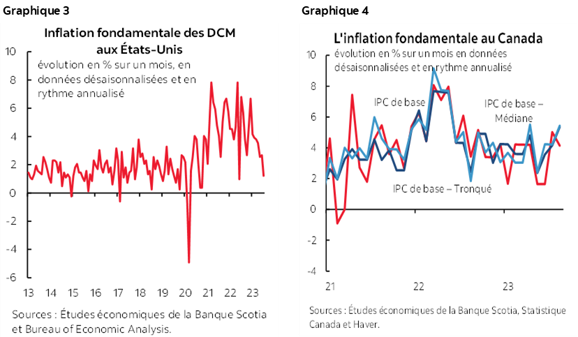 Quant aux facteurs de l’inflation, ils sont nettement plus compliqués que le simple PIB. À la différence des États‑Unis (graphique 3), le Canada doit toujours s’attendre à un passage à vide pour l’inflation fondamentale (graphique 4). Les salaires explosent alors que la productivité s’effondre, ce qui représente la pire combinaison d’effets du point de vue du risque d’inflation. La négociation des conventions collectives est beaucoup plus importante au Canada qu’aux États‑Unis, puisqu’environ un travailleur canadien sur trois est syndiqué (contre un sur 10 chez nos voisins du Sud) et que les négociations sont ambitieuses puisqu’on recherche des gains de salaire nettement supérieurs à la cible inflationniste de la BdC dans les années à venir. Les attentes inflationnistes sont toujours nettement supérieures à la cible de 2 % de la BdC. L’immigration est beaucoup trop élevée par rapport à la capacité du pays à absorber ces courants, compte tenu de la maigreur des parcs de logements disponibles et des autres biens et services nécessaires quand on arrive dans un nouveau pays. Les prix de l’énergie montent en flèche et contribuent indirectement à relever les revenus dans l’économie canadienne et à mon avis, les prix des aliments se mettront de la partie dans les mois d’hiver, non seulement en haussant la pression sur l’inflation de synthèse, mais aussi en répercutant leurs effets sur les prix fondamentaux. La politique budgétaire amorce de nouveau la pompe, et cela se poursuivra dans les comptes rendus de l’automne et dans les budgets de l’hiver. Les stocks des détaillants sont dépouillés. Le dollar CA est sous‑évalué.