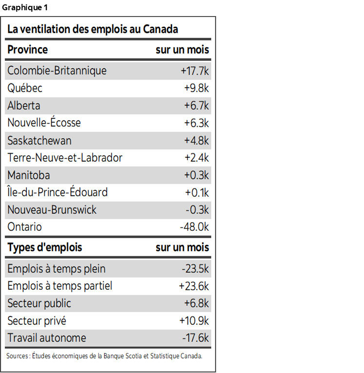 C’est une baisse de l’ordre de 18 000 postes autonomes qui explique que les données de synthèse à l’échelle nationale n’ont pas bougé : cette baisse a masqué une hausse de 11 000 emplois dans les postes salariés du secteur privé et une augmentation de 7 000 emplois dans les postes salariés du secteur public. Les postes de travailleurs autonomes peuvent avoir une valeur inestimable pour l’économie canadienne; or, il s’agit de la catégorie la plus anémique parmi les données estimatives, et je conseille souvent à nos lecteurs de faire fi des fortes variations dans ces données.