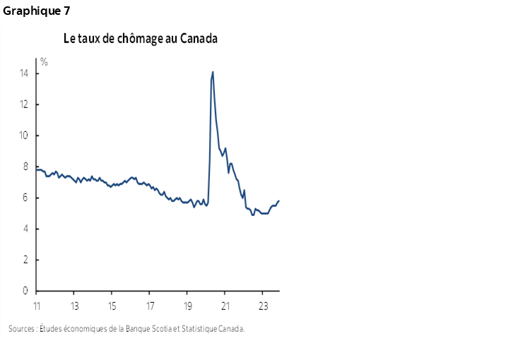 Le taux de chômage du Canada n’a pas bougé, à 5,8 % (graphique 7). En effet, l’évolution globale anémique de l’emploi a été accompagnée d’une légère variation de la taille de la population active (+4,8 k travailleurs), même si la population a augmenté de 74 000 habitants encore le mois dernier.