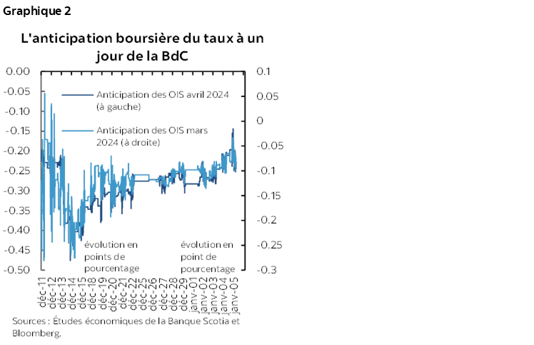 Comme le confirme le graphique 2, le conseil de payer les contrats de mars et d’avril a été plutôt rentable. En prévision de la réunion que tiendra la BdC en mars, les marchés n’anticipent plus qu’une baisse de 6 à 8 points de base après avoir prévu une baisse de 25 points de base aux alentours de la mi‑décembre. À mon avis, il reste encore une certaine marge de manœuvre pour effacer l’anticipation d’une baisse en avril, de l’ordre de 20 à 22 points de base par rapport à une baisse cumulative de presque un‑demi-point anticipée d’ici avril.