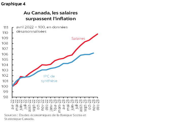 Lorsque le gouverneur Tiff Macklem parle de ce que surveille la BdC, les salaires en constituent un aspect essentiel. L’argument voulant que la progression des salaires soit simplement destinée à compenser le choc de la flambée de l’inflation sur le pouvoir d’achat est depuis longtemps invalidé. Le graphique 4 nous apprend que la croissance des salaires reste obstinément supérieure à l’inflation depuis longtemps. En outre, les conventions salariales collectives pour le travailleur canadien sur trois qui est syndiqué (contre 10 % aux États‑Unis) continuent d’exploser : des gains importants sont cimentés pour les années à venir, même si Ottawa est plutôt lent à actualiser les chiffres.