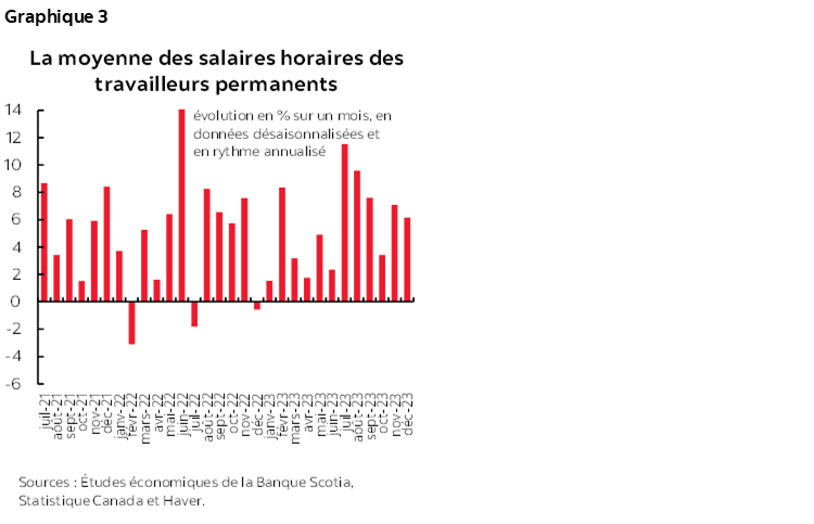 Les chiffres américains ont une incidence externe supplémentaire sur le Canada. Aux États‑Unis, la croissance des salaires s’est accélérée à 4,3 % sur un mois en données désaisonnalisées et en rythme annualisé, et les emplois salariés ont augmenté de 216 000 le mois dernier. Il s’agit d’une toile de fond vigoureuse pour le consommateur américain et, par extension, pour l’économie canadienne.
