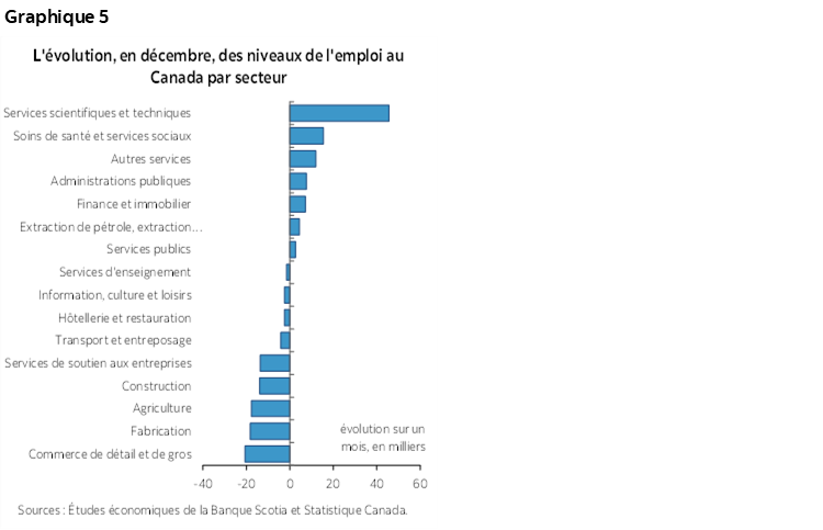 Sectoriellement, l’ampleur a été anémique (graphique 5). Les secteurs producteurs de biens ont perdu 43 000 emplois, et les secteurs des services ont compensé par une augmentation de 43 000 emplois. Dans le secteur des biens, l’agriculture, l’activité manufacturière et la construction ont toutes inscrit des baisses comparables. Dans les services, le gain a été porté par les services professionnels, scientifiques et techniques, de même que par la santé et l’aide sociale et les « autres » services.