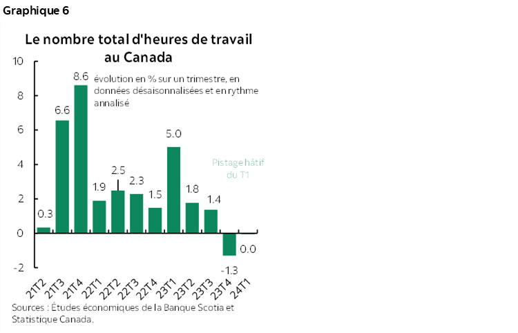 Toujours est-il que les heures de travail se sont repliées de 1,3 % sur un trimestre, en données désaisonnalisées et en rythme annualisé, pour l’ensemble du T4, et si on s’en remet uniquement à l’effet de décalage, il n’y a aucun acquis pour le T1 d’ici à ce qu’on publie les données de ce trimestre (graphique 6).