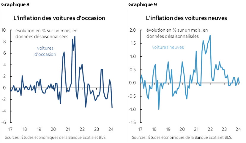 La désinflation des prix des biens a été en partie portée par les prix des véhicules. Les prix des véhicules d’occasion ont chuté de 3,4 % sur un mois en données désaisonnalisées (graphique 8) et les prix des véhicules neufs n’ont pas bougé (graphique 9). La désinflation est venue rogner environ 0,1 % sur un mois, en données désaisonnalisées, sur l’IPC de base en chiffres pondérés.