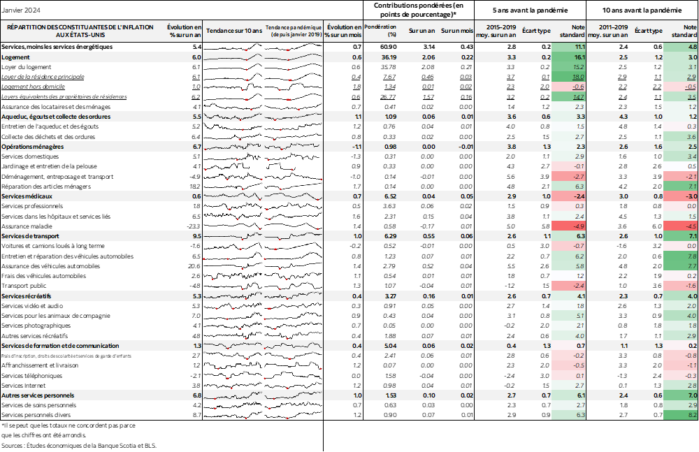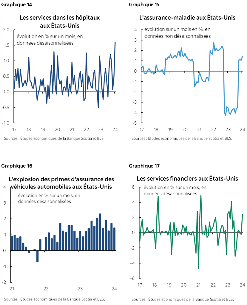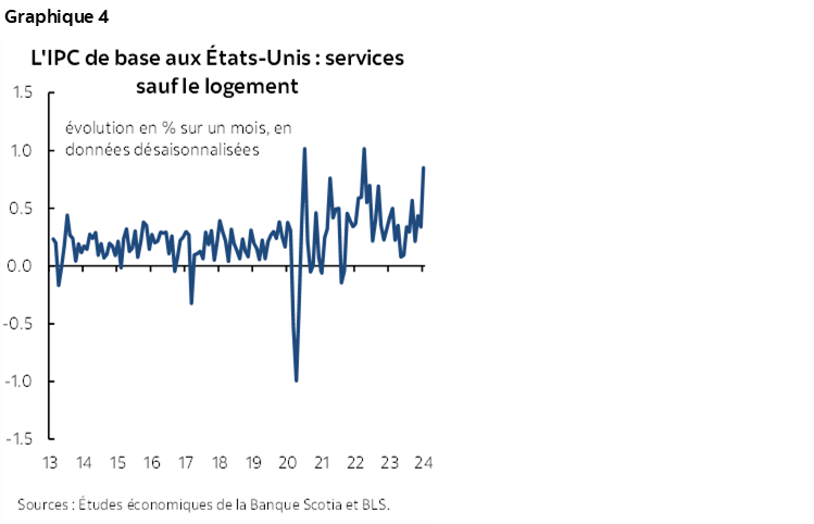 L’inflation des services essentiels (sauf l’énergie et le logement) a bondi de 0,85 % sur un mois en données désaisonnalisées; il s’agit du résultat le plus incendiaire depuis avril 2022 (graphique 4). C’est ce qui nous donne 10,7 % sur un mois en données désaisonnalisées et en rythme annualisé. Autrement dit, le bond de 0,7 % sur un mois en données désaisonnalisées du total des prix des services, sauf l’énergie, ne s’explique pas seulement par le logement; ce résultat est attribuable à une pression haussière beaucoup plus généralisée sur les prix des services.