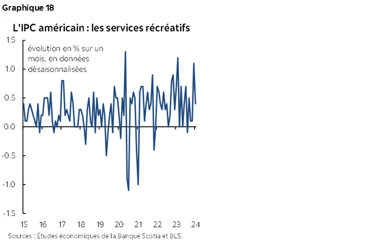 Ce qui a porté l’inflation des services à part le logement? Voici un conseil : ne tombez pas malade (graphiques 14 et 15). Et si vous avez une voiture, je n’ai pas besoin de vous raconter ce qui se passe avec les primes d’assurance automobile qui explosent (graphique 16). Les prix des services financiers augmentent eux aussi (graphique 17). Il ne faut pas s’amuser non plus (graphique 18); ou peut-être que les gens s’amusent déjà trop.