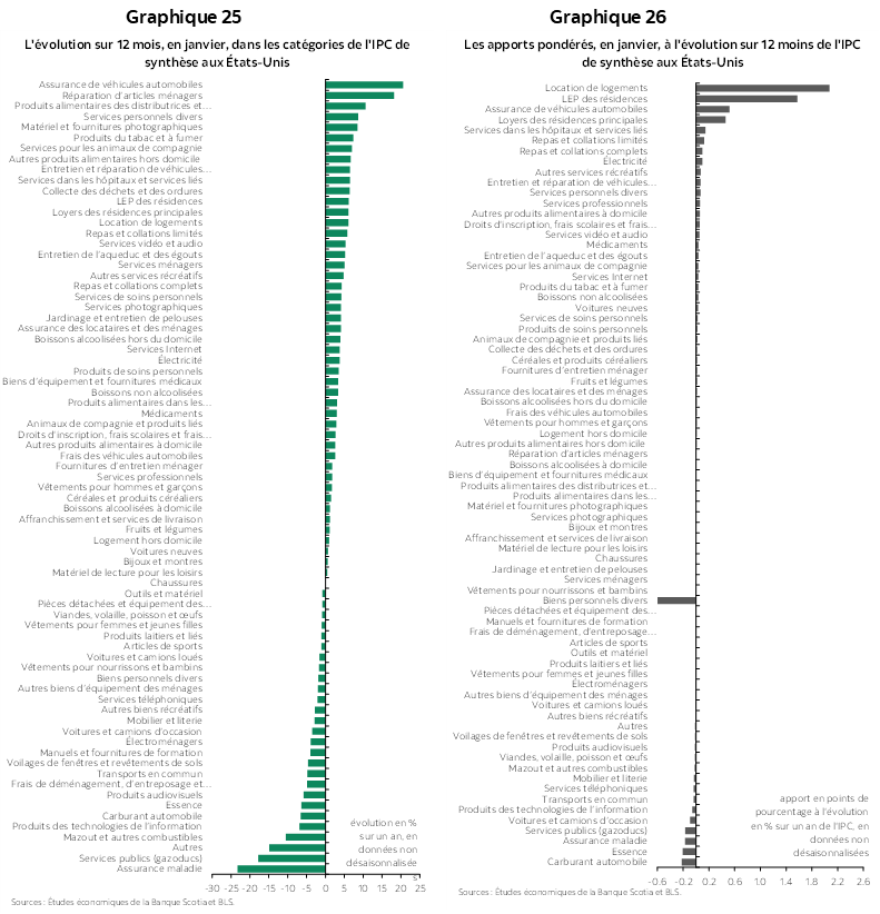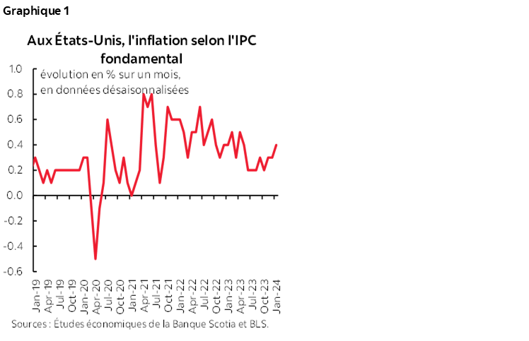 Parlons maintenant de l’IPC canadien qui sera publié mardi prochain. J’ai estimé la hausse de synthèse à 0,6 % sur un mois en données non désaisonnalisées ou à 0,4 % sur un mois en données désaisonnalisées et à 3,5 % sur un an, contre 3,4 %. L’IPC de base traditionnel est estimé à 0,5 % sur un mois en données désaisonnalisées. Il faut aussi tenir compte des déchirantes données sur les ventes de logements qui seront publiées demain et du fait qu’on s’attende à un vigoureux marché du logement ce printemps, pour continuer de repousser l’anticipation des baisses de taux de la BdC, tout en gardant à l’esprit un risque considérable de durcissement des taux. Il faudra que bien des indicateurs évoluent dans le bon sens pour que notre prévision d’une première baisse en septembre se matérialise, et je continue de croire qu’il y a un risque encore plus grand de flambée inflationniste et de hausse de taux au Canada qu’aux États‑Unis.