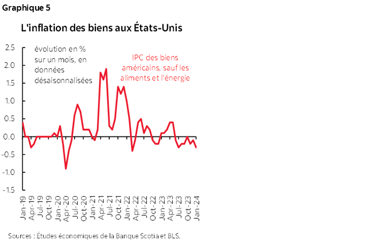 Ce bond des prix des services a été largement suffisant par rapport à celui qu’il fallait pour masquer la désinflation fondamentale des biens de -0,3 % sur un mois en données désaisonnalisées (graphique 5). La désinflation fondamentale des biens reste intacte.