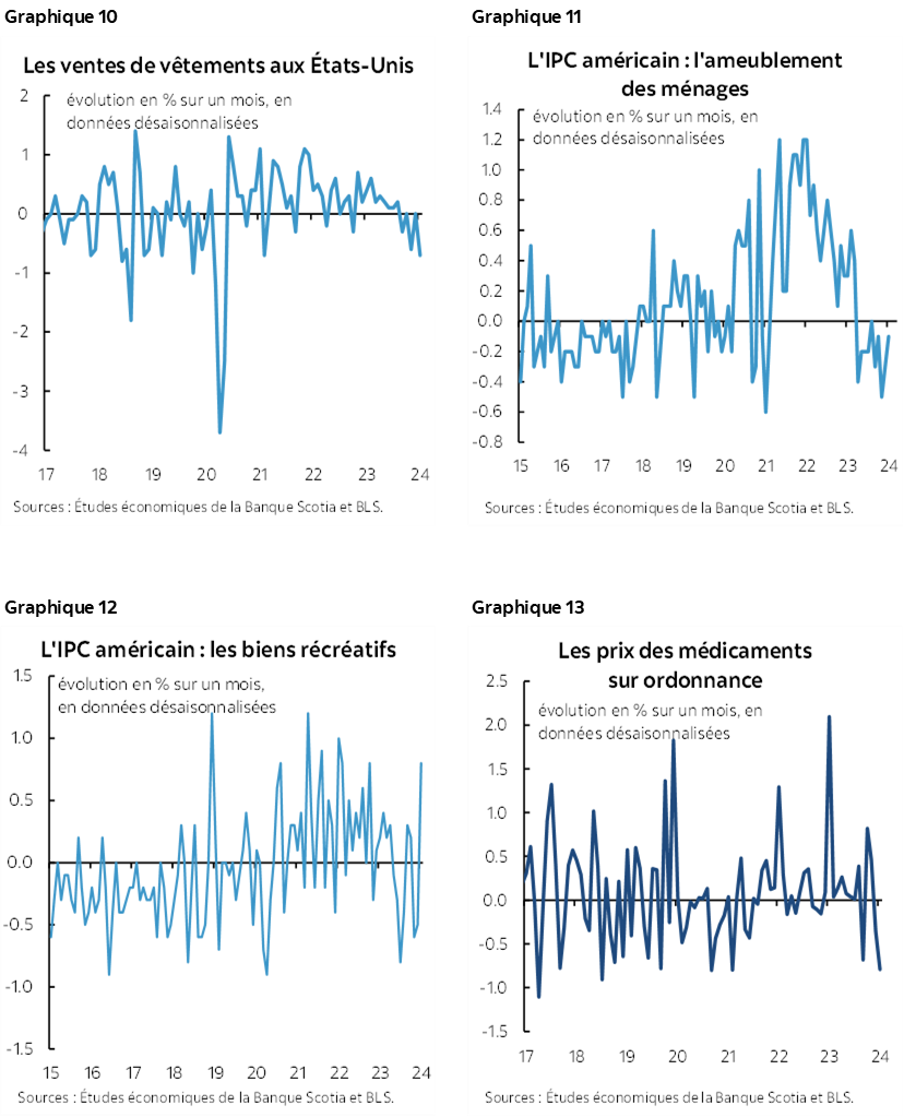 Les vêtements ont aussi écorné les prix des biens (graphique 10). Il en a été de même de l’ameublement (graphique 11), des biens récréatifs (graphique 12) et des prix des médicaments (graphique 13).