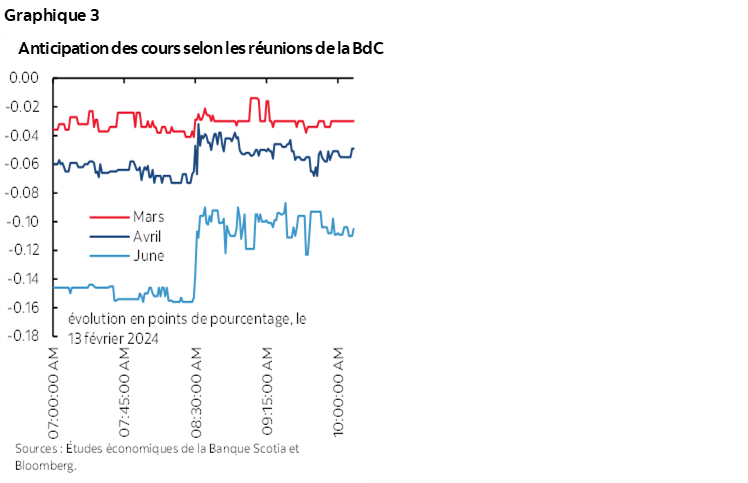 Cette surprise à la hausse et les détails fermes ont fait bondir les rendements : les rendements sur deux ans ont gagné environ 15 points de base pour s’inscrire à 4,6 % et les rendements des bons du Trésor à 10 ans ont augmenté d’environ 14 points de base à 4,28 %. L’anticipation d’une baisse au moment de la décision du 20 mars a été complètement éliminée, puisque l’anticipation de baisses en mai s’est réduite de 7 points de base pour s’inscrire à 10 points de base à peine. Le graphique 2 fait état des mouvements intraséances dans l’anticipation des baisses de taux de la Fed au cours des trois prochaines réunions. Je ne peux pas concevoir que la Fed abaisse ses taux à sa réunion de mai au vu de chiffres comme ceux‑ci et en raison du fait que le PIB américain du T1 sera vraisemblablement vigoureux quelques jours à peine avant la réunion de la Fed. Nous prévoyons au T3 une première baisse, qui pourrait se concrétiser n’importe quand entre juillet et septembre, mais il faudrait d’ici là que la conjoncture se redresse considérablement. Je ne peux toutefois pas éliminer la possibilité d’un redurcissement des taux.