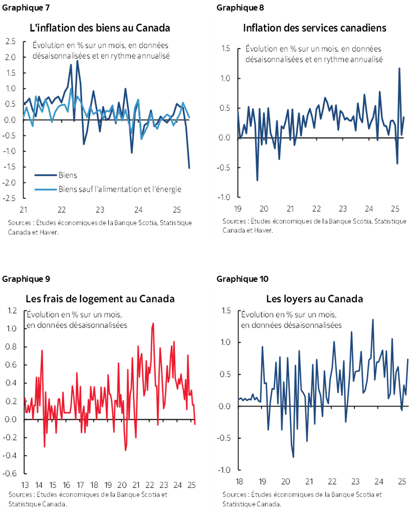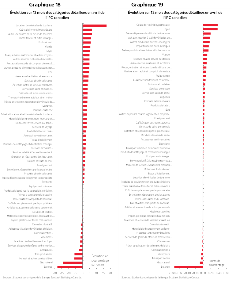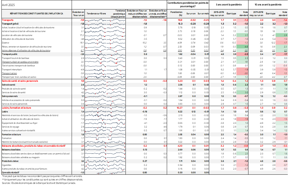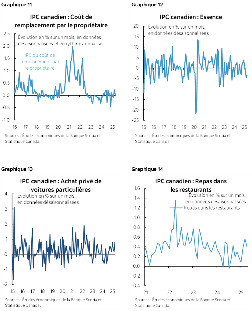 Les voyages organisés sont venus éclairer la pondération de 10 % de la catégorie des loisirs (graphique 6). Les graphiques 7 à 15 mettent en lumière différentes constituantes, accompagnées de quelques observations. Il faut se rappeler que si les prix des biens ont plongé, c’est à cause de la suppression de la taxe carbone qui n’a pas été retranchée dans le sous‑indice, mais qui n’est pas comprise non plus dans les baromètres sous‑jacents privilégiés de la BdC. L’inflation des prix des services s’est accélérée. L’effet de l’élimination de la taxe carbone sur les factures d’énergie des habitations a en partie fait baisser les frais de logement; or, les loyers ont continué de flamber, et le coût de remplacement des propriétaires n’a guère changé. Les prix de l’essence ont perdu 10 % sur un mois, en données non désaisonnalisées et 18,1 % sur un an presque entièrement en raison de l’élimination de la taxe carbone, malgré l’enrichissement des marges des raffineries. Les prix des véhicules, qui continuent d’augmenter, n’ont pas besoin des droits de douane pour empirer, mais ces surtaxes y contribueront certainement. Il se peut que le budget de voyage dépensé en deçà d’une frontière fasse monter l’inflation des restaurants.