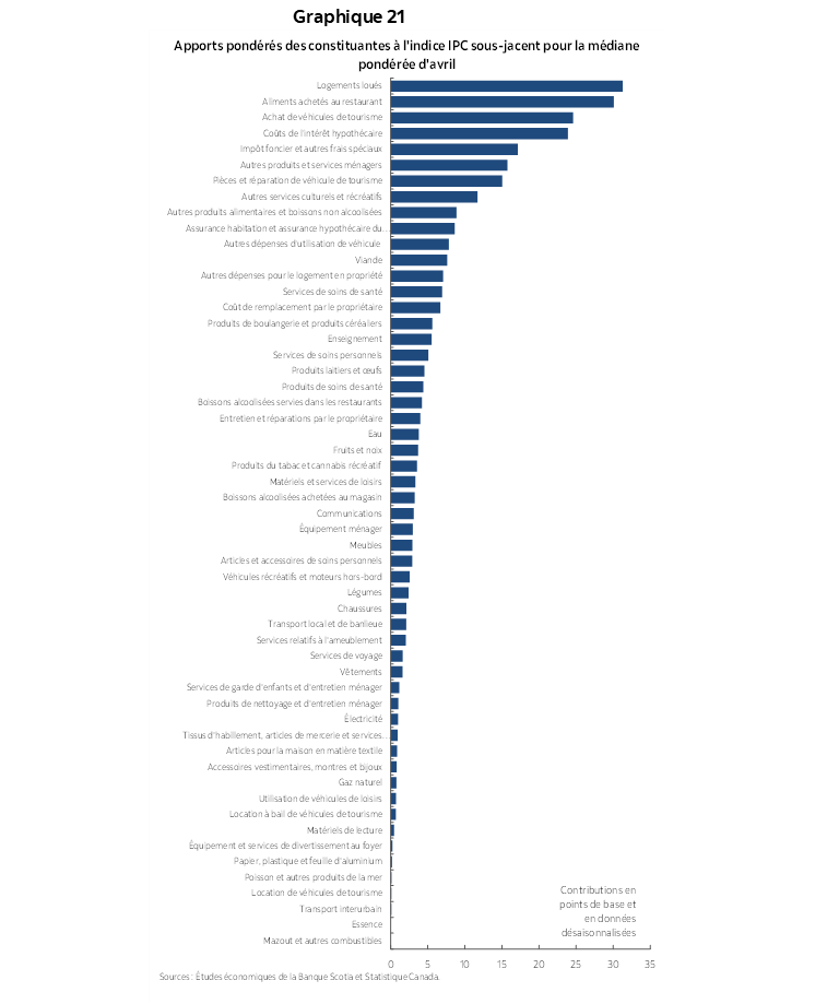 À 3,15 % sur un an, la moyenne des indicateurs de la moyenne tronquée et de la médiane pondérée s’embrase un peu plus que ce que la BdC avait prévu dans ses deux scénarios pour le T2 lorsqu’elle a intégré ses projections dans le RPM d’avril. À l’époque, la BdC a déclaré que dans le scénario 1, l’IPC sous‑jacent s’établirait à 2,9 % au T2 et qu’il s’inscrirait à 3 % dans le scénario 2. Les chiffres publiés aujourd’hui pour avril sont supérieurs à ces deux scénarios, même si évidemment, d’autres données seront publiées au T2. Tiff Macklem a quand même insisté sur l’importance de s’en remettre aux données et a fait savoir qu’il restera sur ses gardes, en suivant les indicateurs avancés, qui flambent plus que les prévisions.