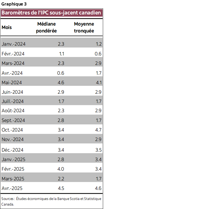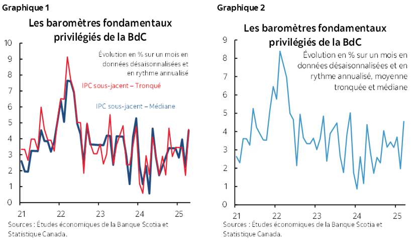 Parlons d’abord des données, puis des commentaires de la BdC. Essentiellement, les baromètres sous‑jacents privilégiés de la BdC s’illustrent dans ce rapport (graphiques 1 et 2). L’IPC en moyenne tronquée s’est envolé de 4,6 % sur un mois, en données désaisonnalisées et annualisées, alors que la médiane pondérée a gagné 4,5 %. Ces chiffres ont permis, de concert avec les révisions, de porter le résultat sur un an à 3,1 % contre 2,8 % (en moyenne tronquée) et à 3,2 % contre 2,9 % (en médiane pondérée). Les chiffres sur un an ne sont pas des indicateurs ponctuels : il s’agit plutôt des apports mensuels pondérés aux résultats de l’année complète, qui sont lents à produire, ce qui explique pourquoi les données désaisonnalisées et annualisées sur un mois, lissées comme vous le voulez, constituent un baromètre privilégié puisqu’il s’agit d’un signe des pressions qui s’exercent sur les prix à la rigueur. Les baromètres sous‑jacents mettent en lumière les tendances centrales plutôt que le bruissement dans les queues statistiques en supprimant le haut et le bas de la fourchette de 20 % du panier (moyenne tronquée) et en mettant l’accent sur le prix pondéré du 50e percentile (médiane pondérée). La moyenne tronquée et la médiane pondérée excluent aussi les effets des changements apportés aux taxes, par exemple l’abolition de la taxe carbone.